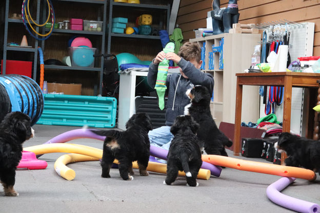 Tijdens het puppy speeluurtje voor fokkers toveren we de trainingshal van Dogs&zo om tot een echt puppy-speel-paleis. Het hele nest mag komen voelen, luisteren, ruiken en ontdekken welke leuke trainingsmaterialen en ondergronden er zijn.